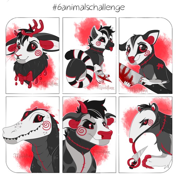 Did the #6animalschallenge with Moosi-fear and I let you guys throw the animals at me! 🔪 She wants to play a game 🩸Which one do you like most? Jackalope, Lemur, Sugar Bear, Alligator, Cow, and Anteater #furryart #digitalart #saw #jigsaw