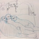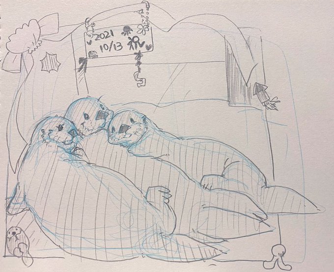 ジョーイちゃんとQちゃんが出会った記念日に絵を描きました!(白黒ですが…) タズちゃんとQちゃんでジョーイちゃんを挟む、とても幸せですね!! これからも仲良く元気に育ってね!!! #JoeyAndHisFriends #JoeyTheSeaOtter