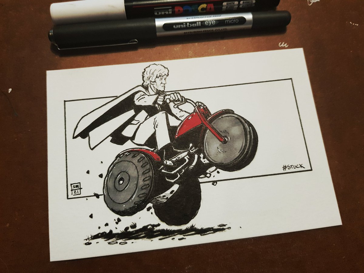 Day 12 of #Inktober2021 postcard doodles... "Even when the 3rd Doctor was stuck on Earth, he was always on the move." #DoctorWho #3rdDoctor #JonPertwee #ActionDoctor #HondaATC90 #Inktober #InkDoodle #PostcardArt #FanArt