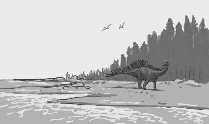 Second #JurassicJune post! Oops, turns out they were both male, but Miragaia doesn't seem to mind. We continue our journey over the lands of the Lourinhã Formation, with some Lusotitan and Dinheirosaurus/Supersaurus patrolling the floodplains. A Draconyx herd in the background.