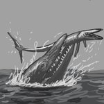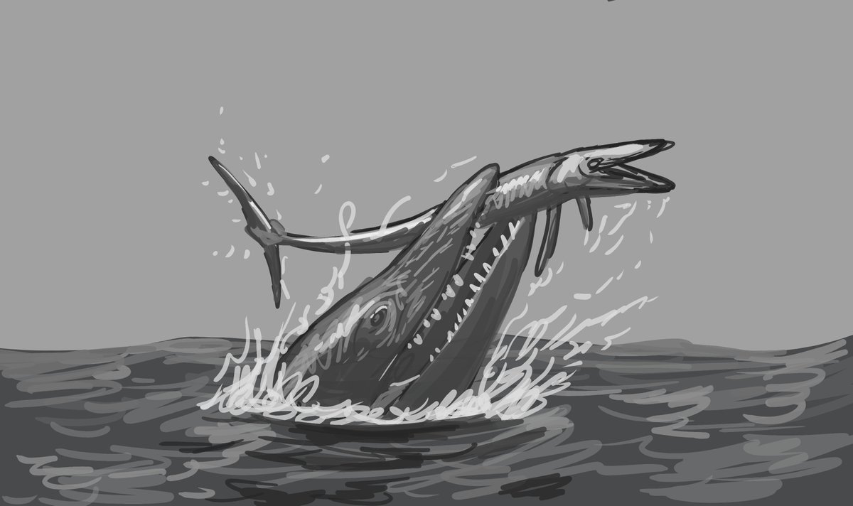 8th #JurassicJune post The Pliosaurus female positions herself below the swarm while the juveniles spook the swarm. When distracted the mother approaches from the depth.