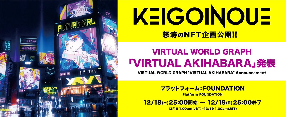 【お知らせ】 10月末から毎週、作品をNFTで出展します!✍️✨ コラボ企画からスタートし、日本をテーマにした新連作「NADESHIKO」 そしてついにVIRTUAL WORLD GRAPHシリーズ2作目「VIRTUAL AKIHABARA」も発表です!😄✨ #NFTCommunity #NFT #nftart #KEIGOINOUE