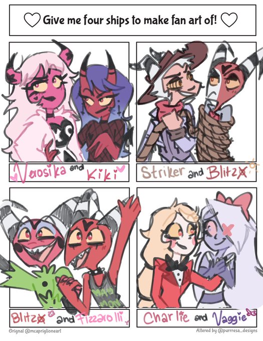 I did the first four I was requested.. I'm sorry, I didn't mean to do many. My files exploted while making the Blitzo and Striker one so it looks weird but at least I drew characters I'm not used to #HelluvaBoss #HazbinHotel #chaggie #verosika #kiki #striker #blitzo #fizzarolli