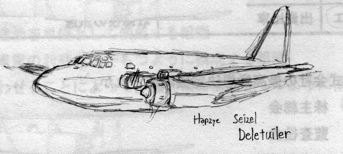 #架空機 #イラスト #KKv_Hapzye 名称 Deletuiler(デリテュイラー) 種別 輸送機 設計 Seizel(セイツェル) 旋回時間 ? 上昇速度 5.9m/s 離陸距離 750m 最高高度 8100m 最高速度 370km/h (高度 2800m) 巡航速度 280km/h 航続距離 2522km 乗員 3名 兵員 30名 主機 Deten MCM901 x 2