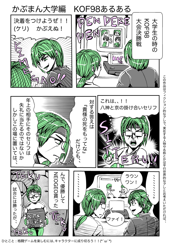 おはっす! KOF98の思い出を漫画にしたよ! そして、本日22:00から youtube.com/watch?v=39_DRV… で、あざみさん@Azami_Vt主催の 近所オブファイターズの解説におじゃまします! #KOF98 #KOF98UMFE #漫画が読めるハッシュタグ #エッセイ漫画 #コミックエッセイ #かぷまん #格ゲー