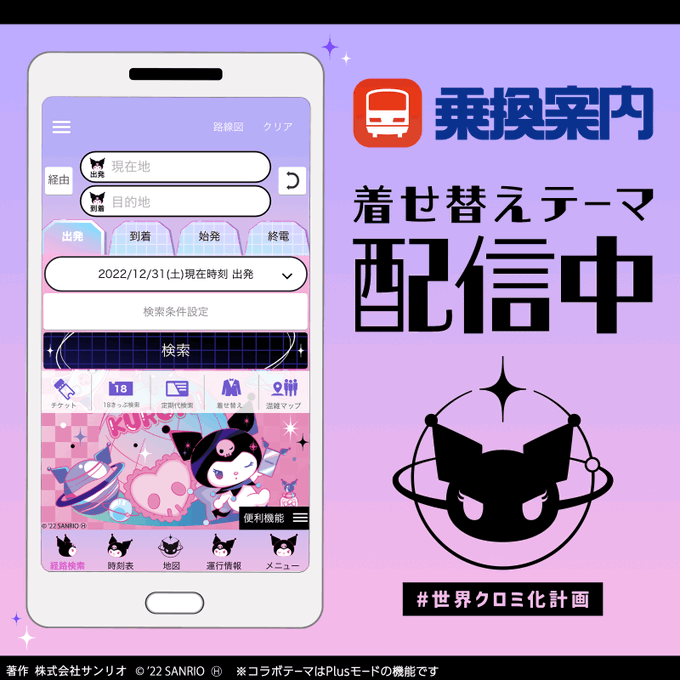 こんにちは、スタッフです😈 #世界クロミ化WEEK が開催決定となりましたが、 クロミ化WEEK 期間中、クロミ様といつでも一緒にいられる 着せ替えがテーマが、乗換案内に登場するようです! #KUROMIES の皆さんは、要チェックです💜 eng.mg/b58c3 #世界クロミ化計画