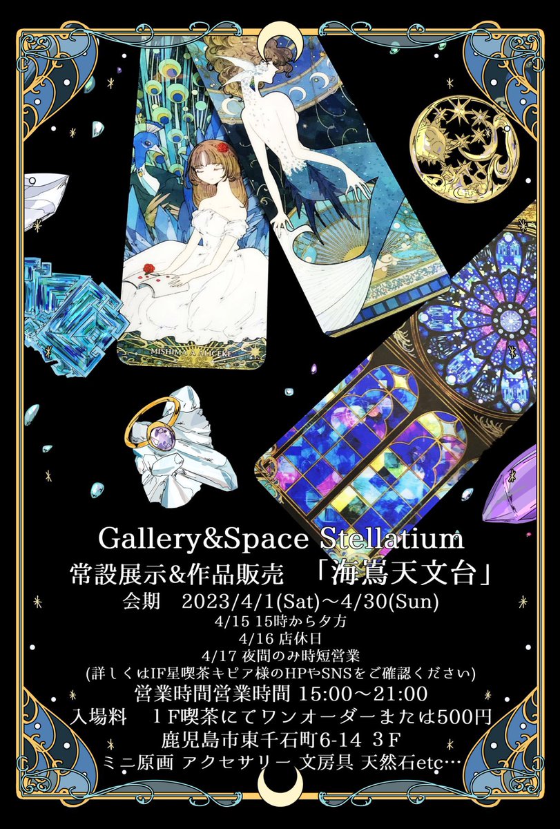【お知らせ】 鹿児島のGallery&Space Stellatiumにて展示&作品販売いたします🌟 ✴︎海嶌天文台✴︎ 会期 2023/4/1(Sat)〜4/30(Sun) 営業時間 15:00〜21:00 入場料 1F喫茶でワンオーダーor500円 場所 鹿児島市東千石町6-14 3F HPはこちら↓ mayonacafe.jp/cipia.html #kagoshima_art #海嶌天文台