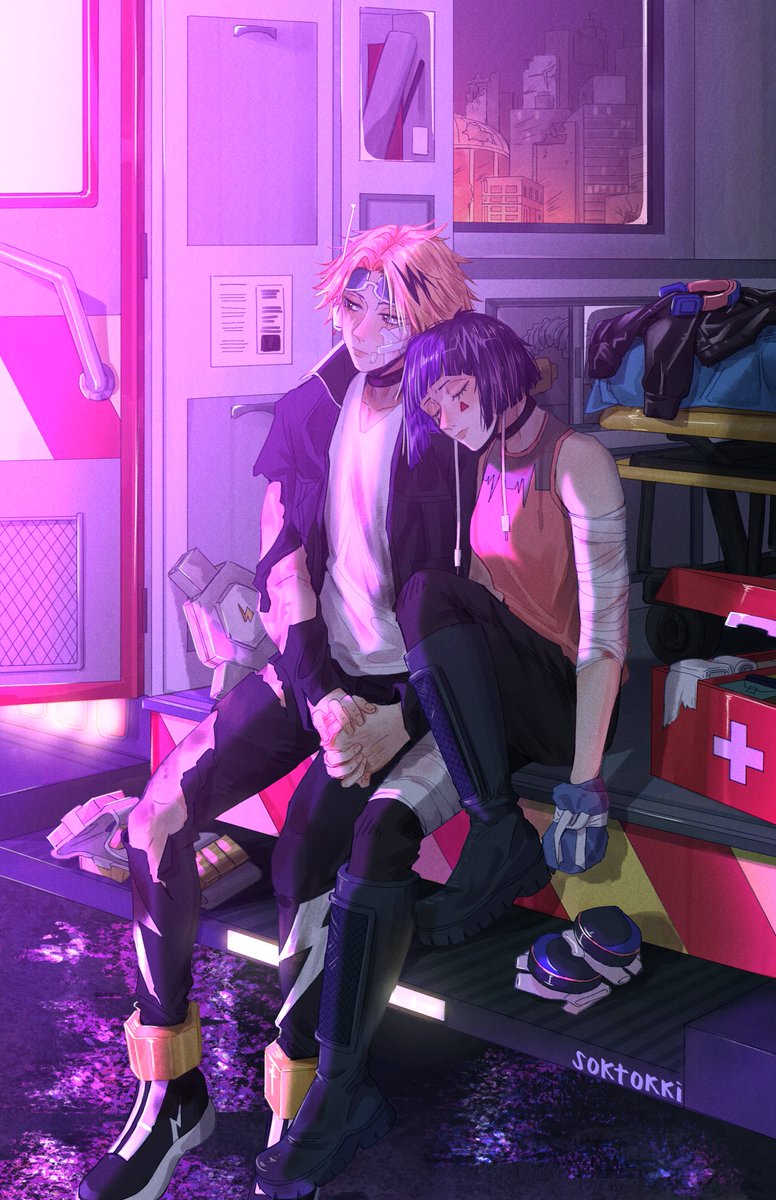 [After a hard day at work] kaminari and jirou offering each other mental and physical support after their hero duties gets me absolutely emotional 😭😭 Heres my full piece for @Amplify_zine !! #bnha #kamijirou