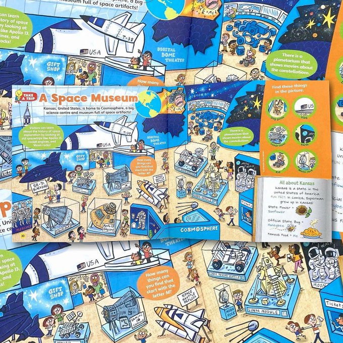 For this months @owlkidspublishing #chirpmagazine @the_cosmosphere #museum in #Kansas I rearranged the most well known items there to exhibit them on 2 pages! Has anyone been there? #spacemuseum #illustration #kidlitillustration #kidlitart #kidlitartist