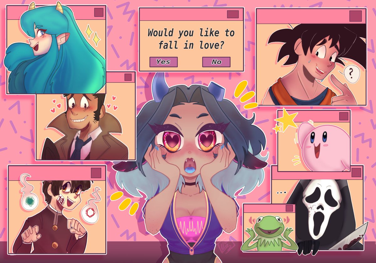 Been working on this big boy for awhile. A very self indulgent piece. I love so many characters man. #vtuber #vtuberart #uruseiyatsura #lupiniii #dbz #hanakokun #kirby #ghostface #kermit #illustration