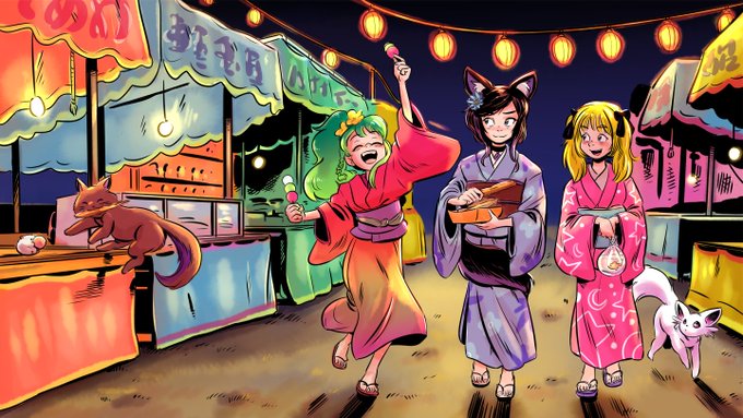 There's no food quite like festival food :D Thank you very much to @/airbornecat for commissioning me to draw this wonderful scene! #RimeriArt #rayumi_art #Konekoillust