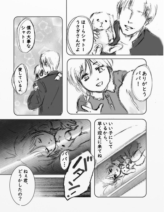 #殺し愛 #koroshiai #ファンアート #漫画が読めるハッシュタグ シャトー「ありがとうパパ!」 パパ「僕の大事なシャトー、愛しているよ」 (パパ、早く迎えに来て) バタン(スーツケースが閉まる) リャンハ「ねえ君、どうかしたの?」
