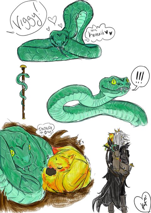 I was compelled to draw Kenni’s magic staff snake Vigdis. Guest staring Kenni himself and Yeller. #dnd #DnDcharacter #dndart #snake #fantasy #impulsecheck #kennethfeathersong #elf #OCart #OC #dnd5e #magic #kota