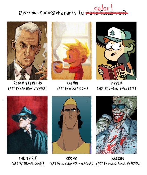 My take on #SixFanarts colors on art by @cameronMstewart Nicola Righi @Giorgio_Spall Thomas Campi Alessandra Melarosa Giulio Ramon Ferrara #rogersterling #madmen #calvin #calvinandhobbes #dipper #gravityfalls #thespirit #kronk #disney #cassidy #preacher #vampire #colorista #art