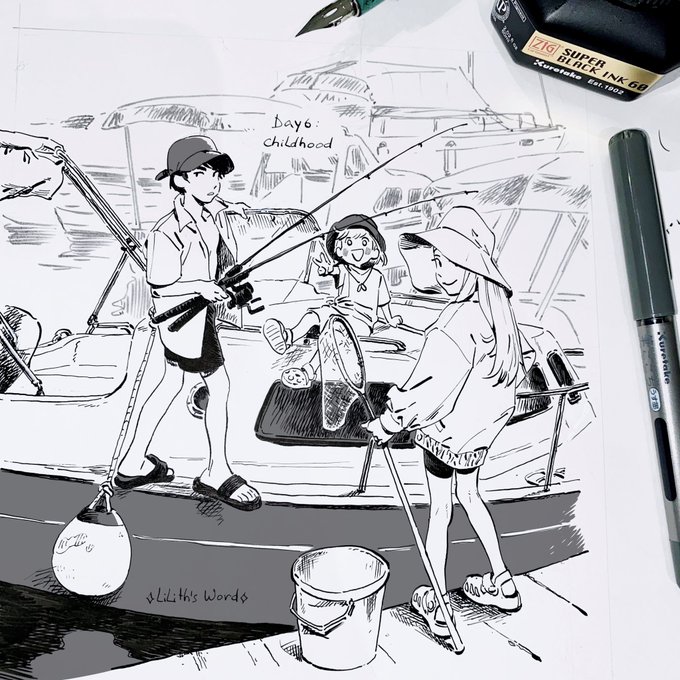 ✦ Day 6 of OCtober: childhood✦ Thomas, Degu and Maria 🚤 a photo from when they were kiddos! Tools: ZIG cartoonist super black ink 60, fudegokochi brush pens (and I’m adding gray fillings digitally) #kuretake_inktober