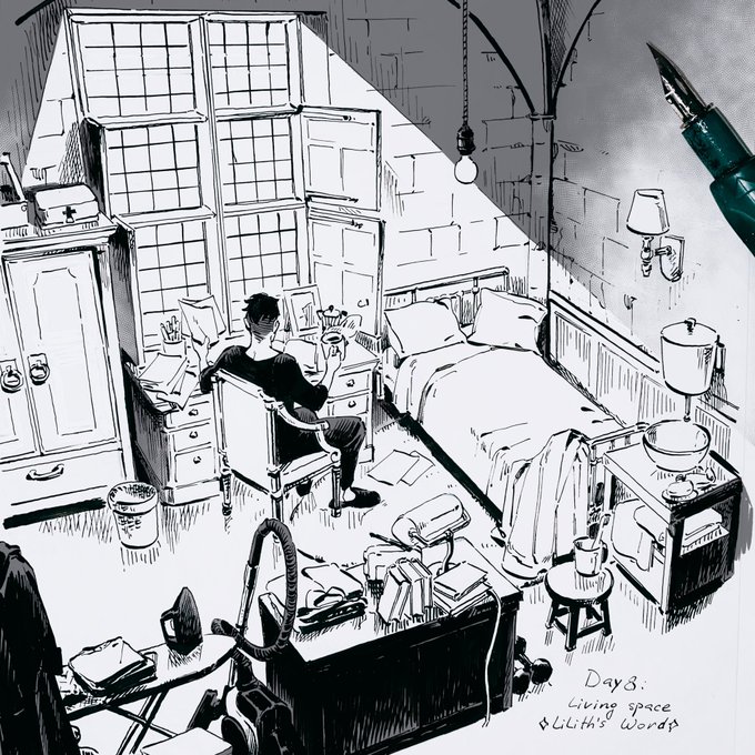 ✦ Day 8 of OCtober: living space✦ Tom’s humble abode (and the last time I’m drawing an interior traditionally 🙃) PS- what do you mean it’s day 19 of October Tools: ZIG cartoonist super black ink 60, kuretake fudegokochi brush + digital gray tone #kuretake_inktober