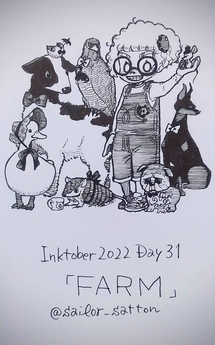 31日目 農園 FARM 画材 ZIG Cartoonist MANGAKA 55号くれ竹筆ぺん 筆ごこち・白筆ぺん #inktober2022 #kuretake_inktober2022 #Inktober_PerfectChallenge #kuretakeinktober2022_giveaway #イラスト 今年は生き物を沢山描いたので 最後も描いてみました😆 これにて大団円🌟