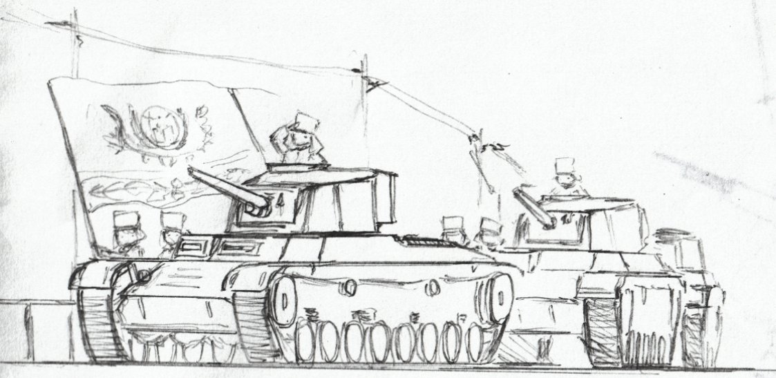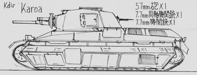 #架空戦車 #イラスト #LC_Kdirlt 名称 Karoa 乗員 4名 主機 Coma UDP V型8気筒ガソリン 主機冷却 液冷 最高速度 31km/h 砲塔旋回速度 9.2°/s 主砲 57mm砲[Mainse Ms.Kd57U1] 1基 弾種 徹甲弾(AP),硬芯徹甲弾(APCR),榴弾(HE) 最大貫通力 86mm 装填速度 6秒 装弾数 82発 →