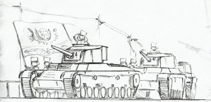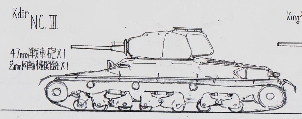 #架空戦車 #イラスト #LC_Kdirlt 名称 NC.III 所属 法制国クディル共和国自由国防陸軍[KNDA] 塗装 緑[通常],森林迷彩[山岳部隊],黄+緑混色迷彩[防衛戦末期(世界戦争中盤)] 種別 中戦車 乗員 5名 主機 Coma Co.ml255-v8 V型8気筒ガソリン 主機冷却 液冷 最高速度 32km/h 砲塔旋回速度 3°/s →