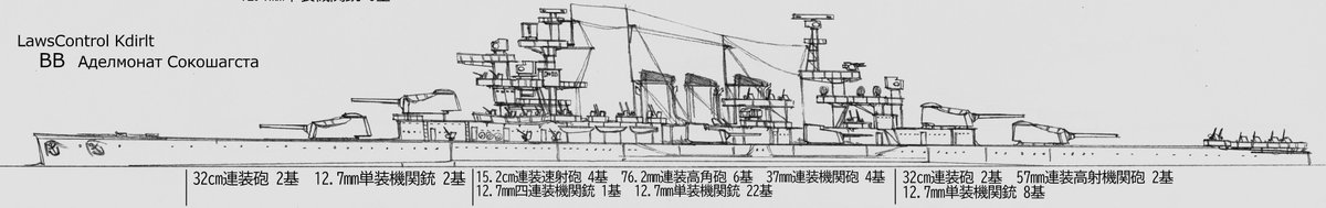 #架空艦 #イラスト #LC_Kdirlt 名称 Аделмонат Сокошагста(アデルモナト ソコシャグスタ) 戦艦 主砲 32cm連装砲 4基 副砲 15.2cm連装速射砲 4基 対空 76.2mm連装高角砲 6基 機砲 57mm連装高射機関砲 2基 機砲 37mm連装機関砲 4基 →