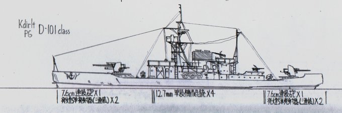 #架空艦 #イラスト #LC_Kdirlt 名称 D-101級 砲艦 所属 法制国クディル共和国自由国防海軍[KNDN] 塗装 河川迷彩(緑,茶,水),灰色, 主砲 7.6cm連装砲 2基 機銃 12.7mm単装機関銃 4基 発煙 発煙弾発射器(三連装) 4基