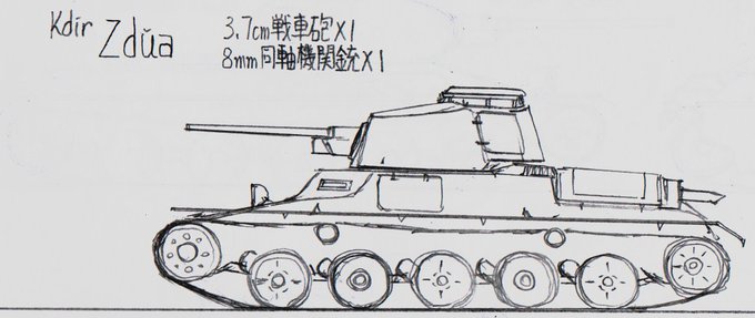 #架空戦車 #イラスト #LC_Kdirlt 名称 Zdŭa(ツア/ヅダ) 所属 法制国クディル共和国自由国防陸軍[KNDA] 塗装 暗緑色(初期),暗緑色+赤白二重帯(初期,政府近衛) 種別 軽戦車 乗員 3名 主機 BREMDA SSFSty.v.6A1 V型6気筒ガソリン(バラゾウ法国製) 主機冷却 空冷 →