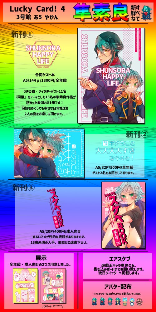 【3号館あ5/やかん】 お品書きです。 新刊は超目玉の分厚い隼素良ゲスト本1冊と個人誌2冊の計3冊です。 その他、展示漫画を2種とアバター配布もしております! 当日はエアスケブもさせて頂きたいです。 沢山の隼素良をご用意しました。イベント楽しみです!どうぞ宜しくお願いします🌷 #LCard4_on