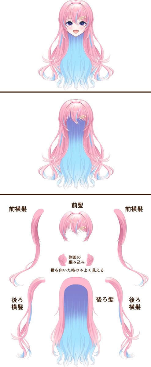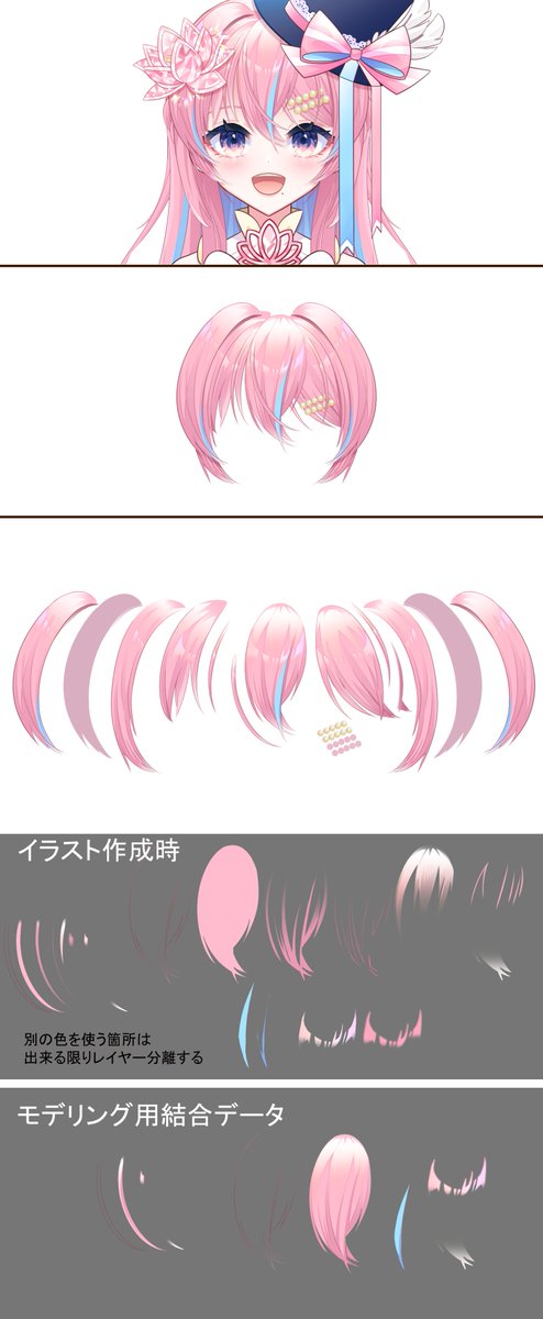 ループモーション動画用キャラクターの分離。 動画キャラは斜め向いてる場合が多く、 横髪で頭を前後に挟むパーツ構成になるので、 前髪、横髪、後ろ髪という分離ではなく、 「前面髪の毛」 「中面髪の毛」 「背面髪の毛」 というような分け方にする #Live2DWIP #イラスト依頼 #LIVE2D依頼