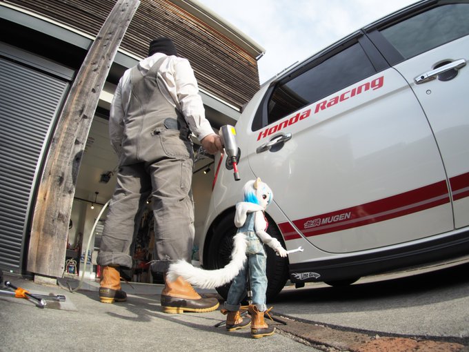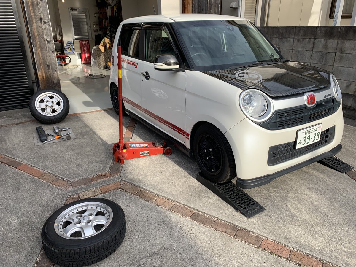 スタッドレスに交換するにゃ❤️ しろちゃん小さなスパナ🔧使わないよ。゚(゚´Д`゚)゚。 #hondanone #ドールとオーナー #無限CF48 #無限MR5 #llbean #beanboots