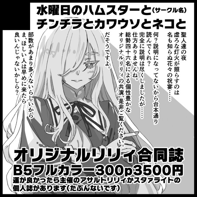 入稿完了しました。 2021年10月31日(日)に開催のLilienplatz2nd GARDENにて『オリジナルリリィ合同誌 Vol:1』を頒布予定です。 ・B5フルカラー/304ページ/3500円です。 通販はBoothで展開予定(4000円)。 場所は東京都大田区産業プラザPiO 小展示ホールです。 #オリジナルリリィ合同 #LLP2nd
