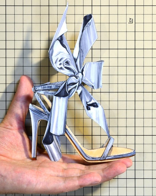 【今日の靴】01960足目🎀 “LOEWE” Bow 100 Metallic-Leather Sandal(FW2022) #LOEWE #jonathananderson #illustration #copic #copicmarkers #切り絵 #イラスト #コピック