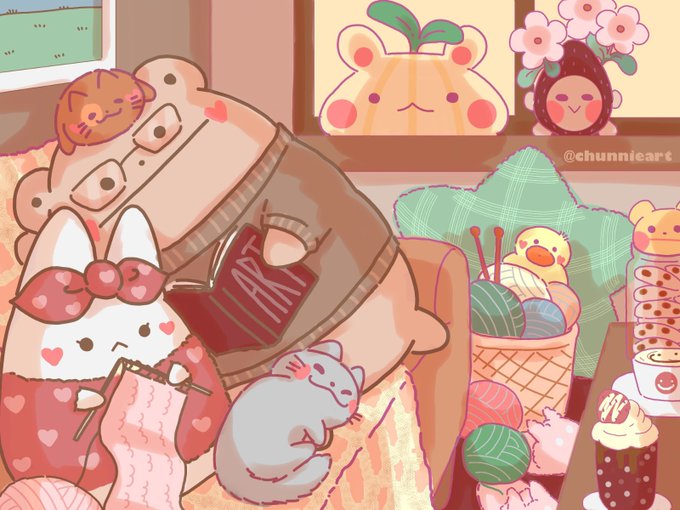 All I need forever is youuuuuu. 💚❤️🤍🤎 Cozy knitting time. 🥰 #artistsontwitter #digitalart #cuteart #muuchuustory #chunnieart #lovely #coupleart #illustration #artist