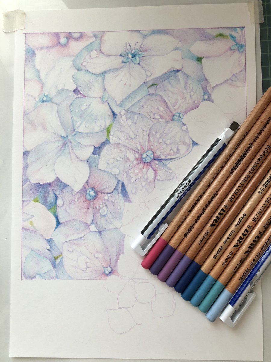 🙋♀️目標 紫陽花の季節が終わる前に 完成🙌 紫陽花の葉っぱを1枚頂いてきたから、下に描こうかな🎶 #紫陽花 #色鉛筆 #LYRAはケント紙よりBeアートペーパーの方が相性イイみたい #スカーフの模様みたい #LYRA