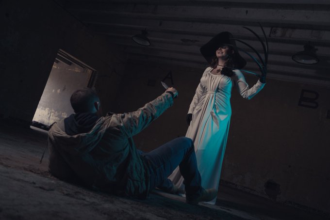 Lady D gonna get you, Ethan 📸 @jsbissett Ethan is @ChrisMason316 Lady D is myself #ResidentEvil #LadyDimitrescu #LadyDimitrescucosplay #residentevilcosplay