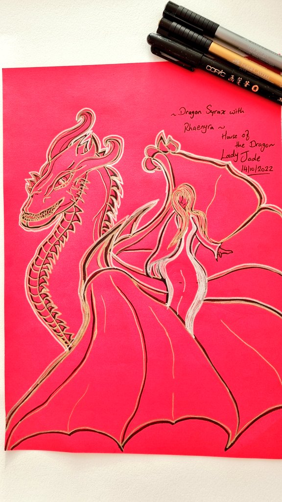 Princess Rhaenyra of House Targaryen on #DragonSyrax🐉 #Inking:Copic Brush pen and Faber Castell Metallic markers (Gold & Silver) Anyone else liking the contrasting colours? 😁 #HOTD #blackandgold #sketch #FANART #LadyJade_12 #ArtistOnTwitter #drawing #HouseOfthedragon #inktober