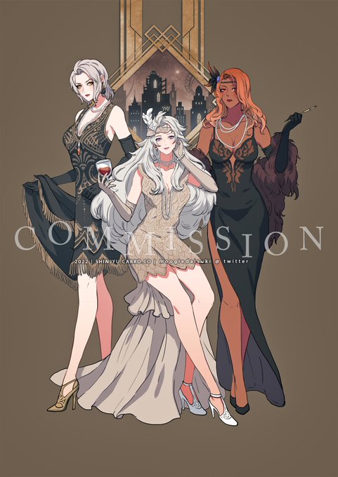2022 commission for Suki Thank you so much again! 💖 ( 1920s genderbending version of The Unsundered ) detail shots below 🔽 #Elidibus #EmetSelch #Lahabrea #FFXIV #genderbender #shinjyuart