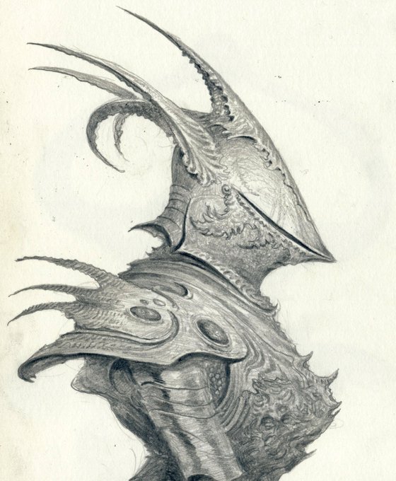 Lancer - pencil on moleskine paper. Can’t help but drawin those Ian Miller spikey bits. #lancer #fantasy #drawing #sketch #sketchbook #portrait #spikes #art #artwork #moleskine #moleskinesketch