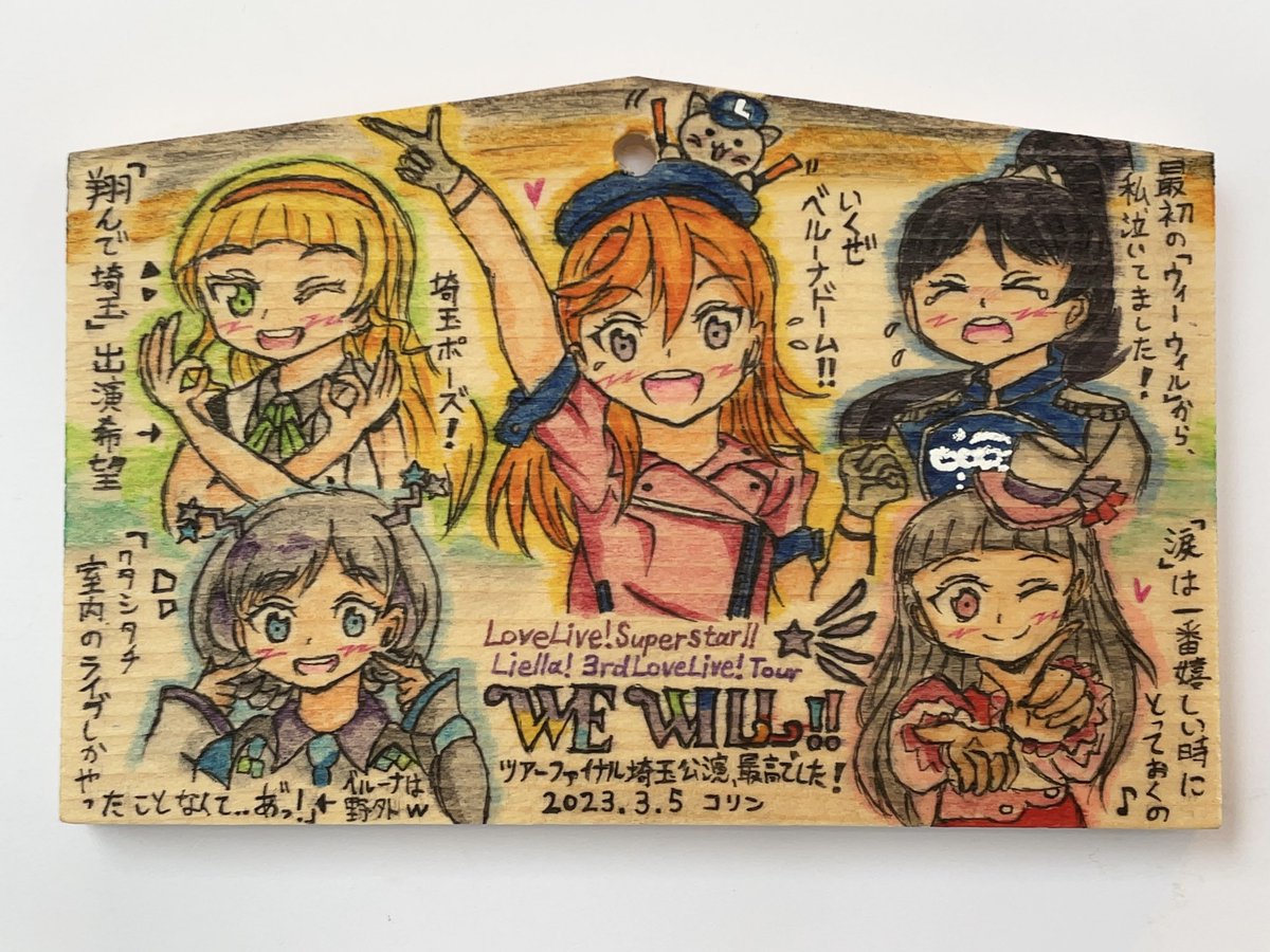 3/4.5、ベルーナドームで開催されるラブライブ!スーパースター!! Liella! 3rd LoveLive! Tour ~WE WILL!!~ ライブ内容を参考に、Liella!先輩+べるーにゃを穏田神社の絵馬に描きました。 ラストを彩る最高の埼玉公演でした(・∀・) #lovelive #Liella #Liella_3rd_埼玉Day1 #Liella_3rd_埼玉Day2
