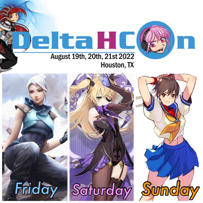 My @DeltaHCon Cosplay Lineup! 😁 Friday: Jett - Valorant Saturday: Fischl - Genshin Impact Sunday: Sakura - Street Fighter #deltahcon #cosplay #lineup