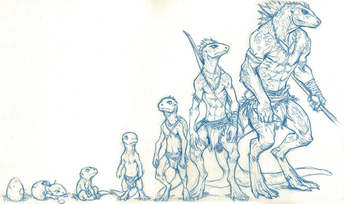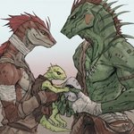 Young family of lizard people. Like mantises, their skin color adapt to their favorite ground/field until they reach adulthood. #Lizardfolk #Dnd #Lizardman #Family
