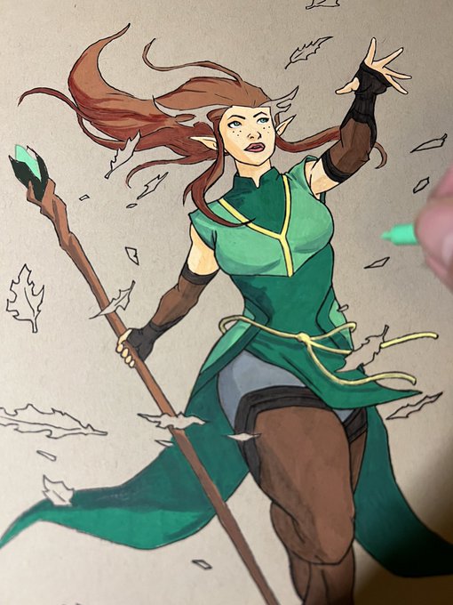Alrighty! She’s done! Keyleth, of the Air Ashari! Acrylic paint pens, marker, and ink on paper. This was an experiment for me, I feel like I pretty well hit the cel-shaded vibe I was going for. I’ll have here with me at #ECCC, table L-19 this weekend! #CriticalRoleArt #lovm