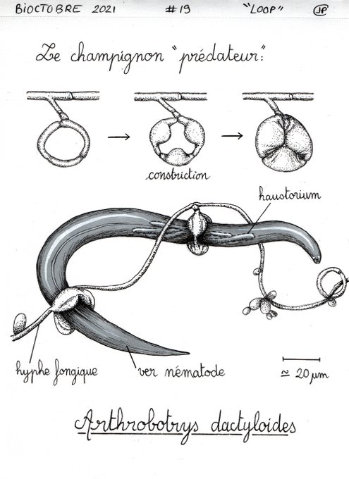 #bioctobre2021 #inktober2021 : j19 #loop Comme avec un lasso, ou un piège à collet, certains champignons piègent de minuscules vers #Nematodes du sol. Une fois le ver capturé, il se développe à l'intérieur et exploite les ressources via l'haustorium. #fungi #worm #boucle #sciart
