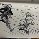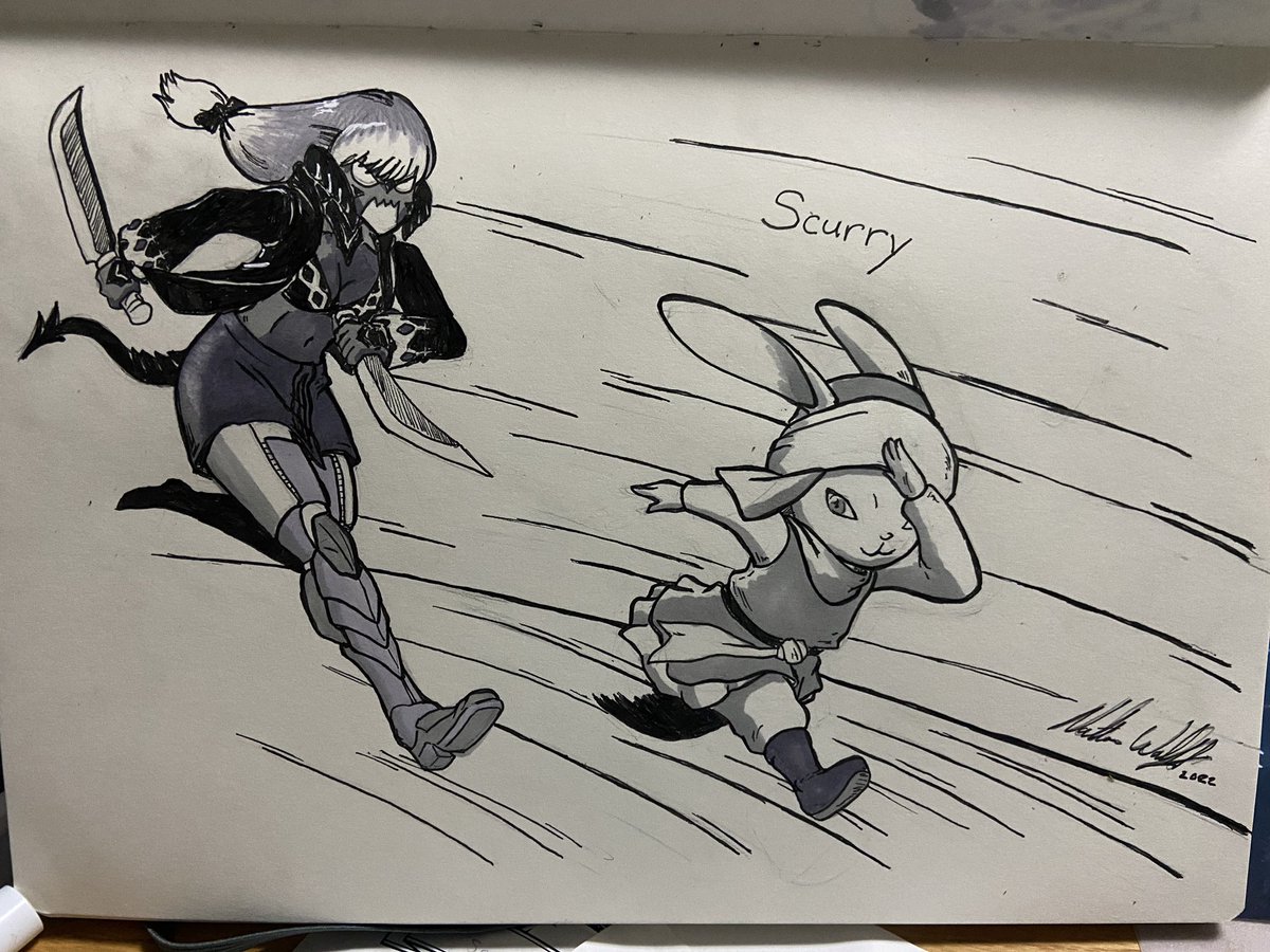 FFXIV Inktober day 2: A loporrit scurrying away from an angry Au Ra. #inktober2022 #scurry #FFXIVART #ffxivaura #loporrit