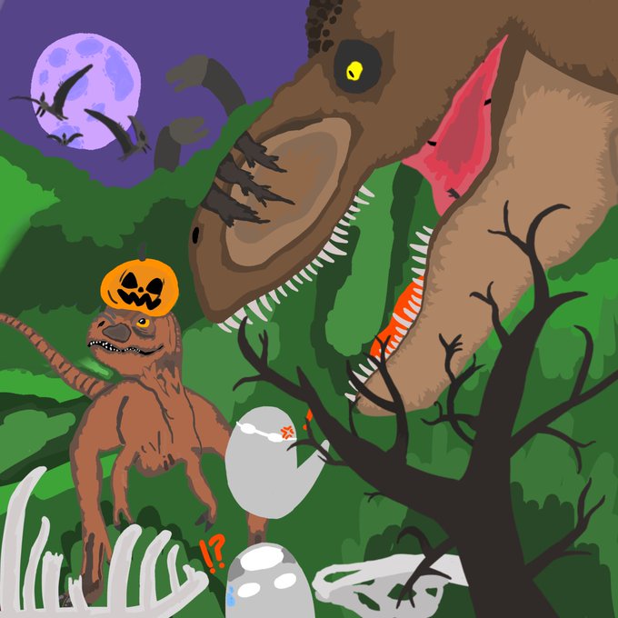 マジ疲れた.... ジュニアとドゥ。奥にいるのはプテラとマメンチ。 #イラスト #アイビスペイント #ティラノサウルス #ロストワールドジュラシックパーク #LostWorldJurassicPark #ハロウィン #Halloween #halloween2021 #ハロウィンイラスト展示会2021 #HappyHalloween #恐竜 #古生物