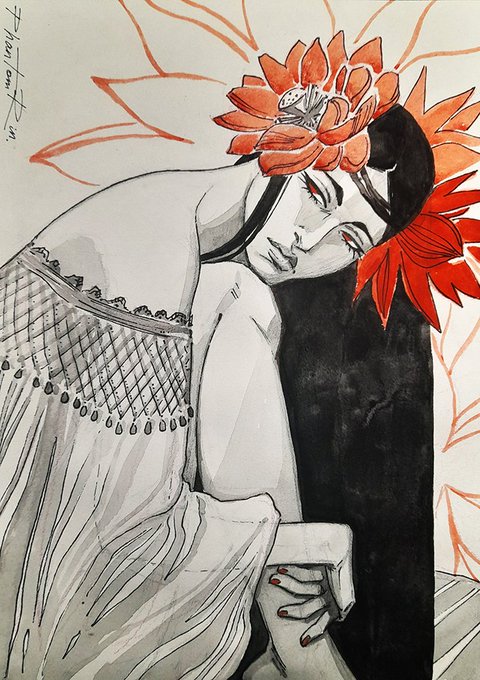 Inktober. Day 2 - Lotus. #Inktober #Inktober2022 #Lotus #flowers #red #girl #art #illustration #traditionalart #PhantomRin