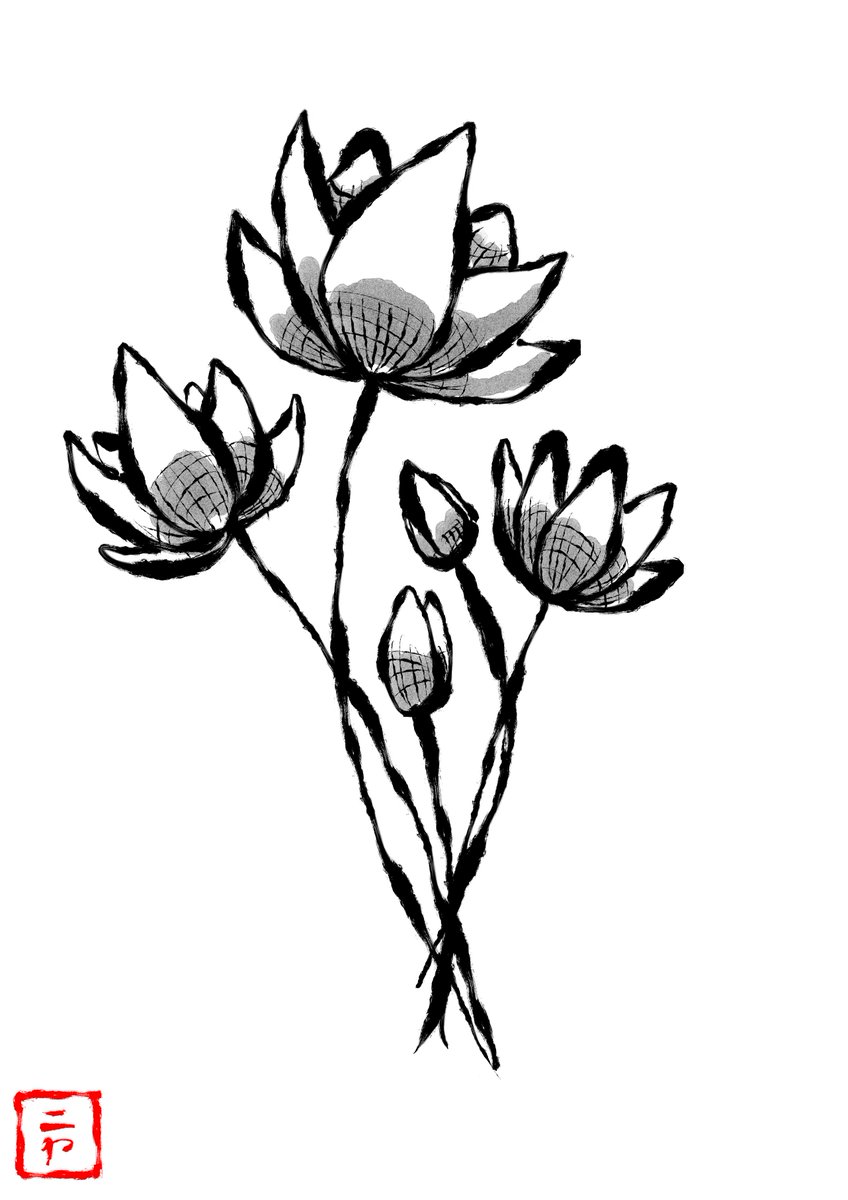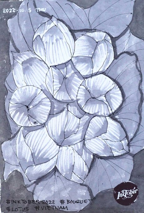 10月6日(木)今日のInktoberのお題は「ブーケ」。ベトナムではやはり蓮の花がふさわしいと思いましたが、白黒だけで表現するのはなかなか難しい。 #inktober2022 #inktober #inktober2022day6 #bouquet #lotus #vietnam