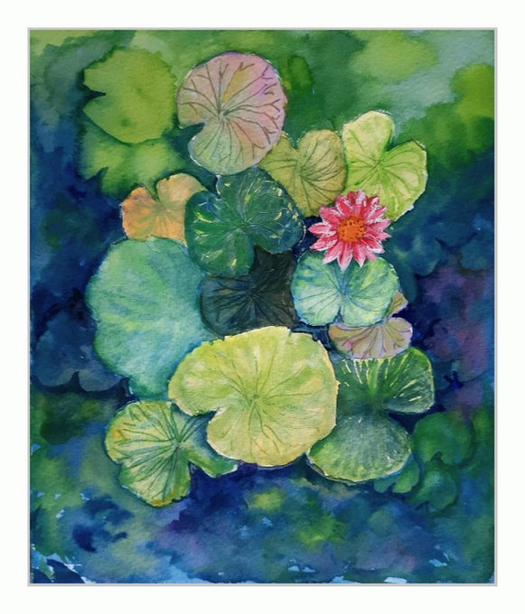 Lotus Pond - Watercolour Water Lilies on paper by Asha Shenoy #Watercolour #MothersDay #gift #floralart #ClaudMonet #lotus #GardenGalaxy #GardeningTwitter #watercolor artfinder.com/product/lotus-… #MakingArtWork via @artfinder