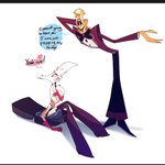 A commision from the lovely @misspanica1 ! Loud and Angel do occasionally grt up to mafia antics together and well, it's always a blast with these 2 lovebirds. #HazbinHotel #HazbinHotelOC #Hellsona #Loudmouth #LoudDust #AngelDust #HazbinHotelAngelDust #HazbinHotelFanart
