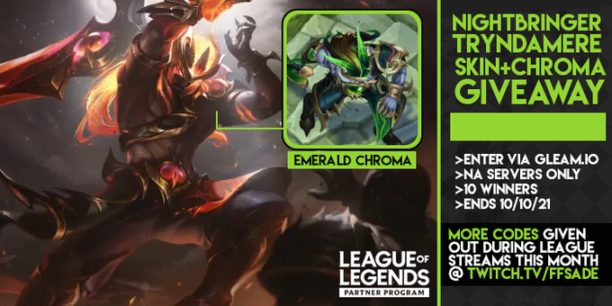 More codes to give out for League peeps! This time, Nightbringer Tryndamere + Green Chroma (NA ONLY)! Just enter via the Gleam link below. Giveaway ends on the 10th! gleam.io/TEQfF/nightbri… #LPP #LeaguePartner