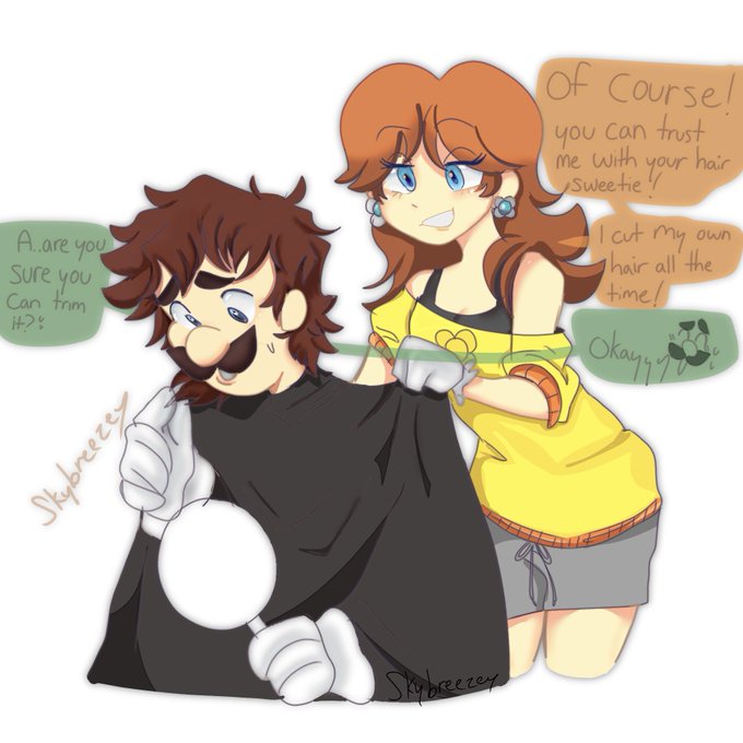 Part (1/2) Luigi’s overgrown haircut Ok yes I know..I forgot to colour in the mirror 😣 I just realized that now as I’m posting this..but it’s okay! Does daisy REALLY know what she’s doing? 🤔 #luaisy #luigifanart #luigi #daisy #daisyfanart #mario #MarioBros